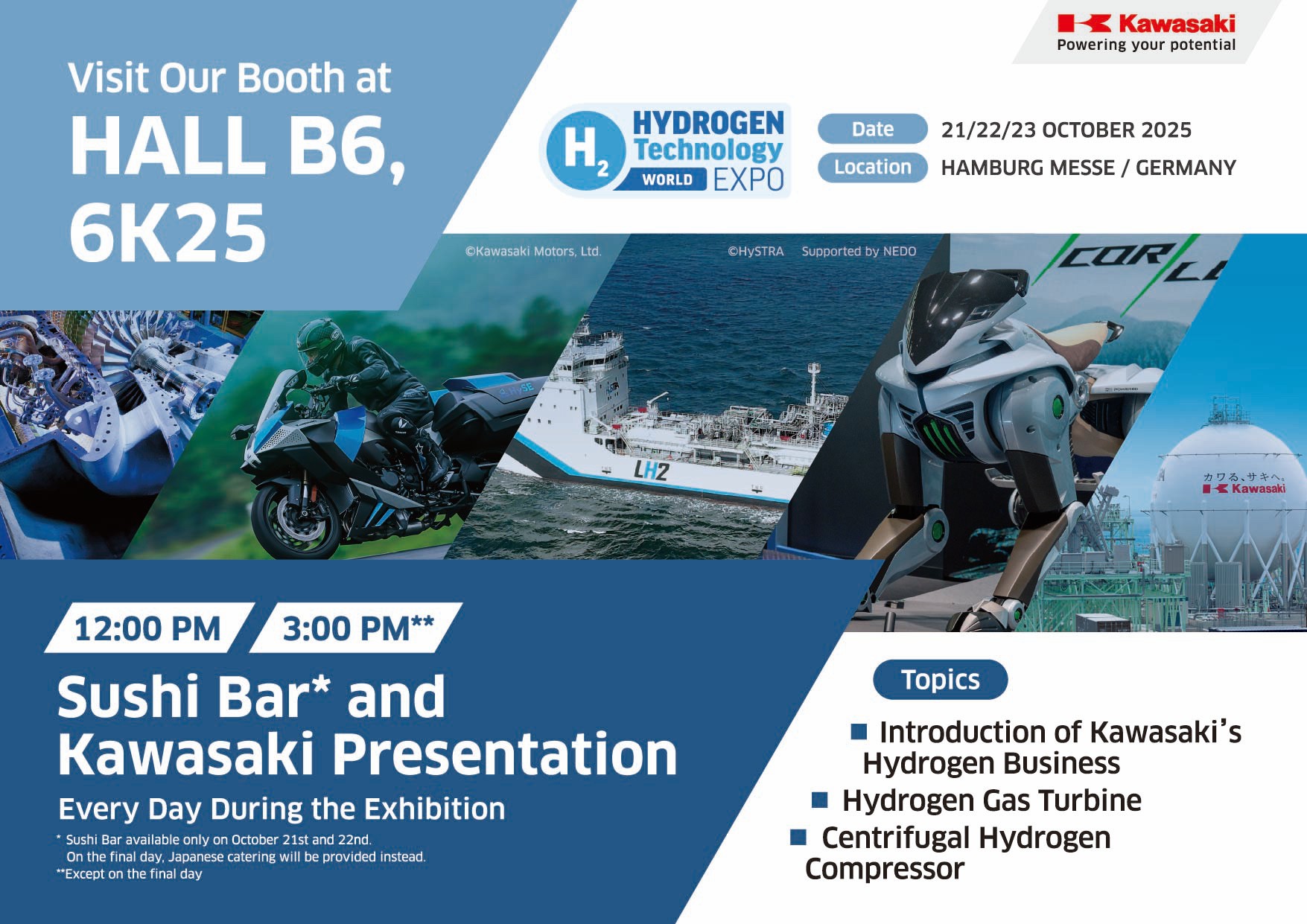 Kawasaki and Kawasaki Gas Turbine Europe GmbH (Germany) are exhibiting at a leading international event dedicated to the advancement of hydrogen technologies and the global hydrogen industry; “Hydrogen Technology World Expo 2025” in Hamburg, Germany from Tuesday, 21 to Thursday, 23 October 2025.